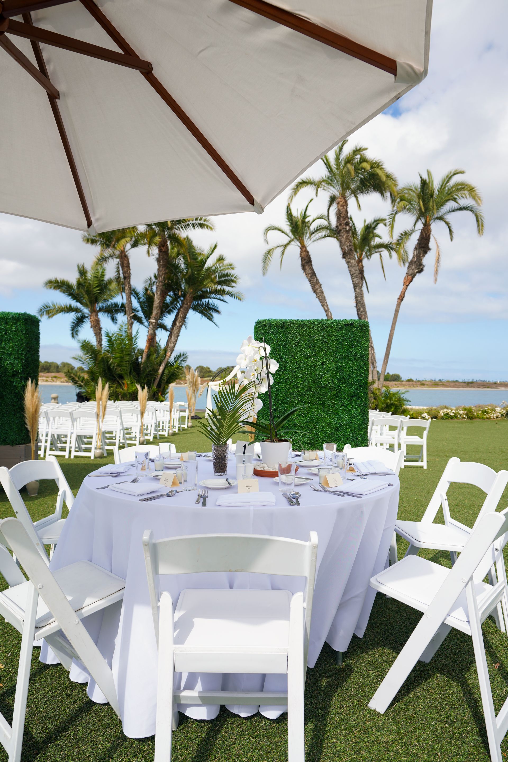 The ceremony took place under the swaying palms and clear blue skies, with the gentle waves providing a soothing soundtrack. The elegant yet tranquil outdoor setup perfectly complemented the couple’s sophisticated style.